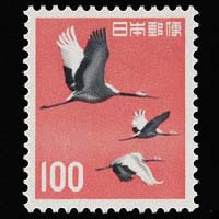 | 解説文 | 通称「動植物国宝図案切手」。それまでの産業図案切手にかわって、国宝や特産動植物などを主題にしたシリーズ。タンチョウ(ツル科)は日本の代表的なツルとされている。北海道の釧路川、雪裡川流域には留鳥として年中生息していて、天然記念物として保護されている。タンチョウツルは翼の長さ62から66センチ、真白で頭頂が赤く、額と目先は黒、のどから後頸(こうけい)にかけて暗石板色、次列と3列の風切羽は黒く、3列風切は長くのび、白色の尾羽をおおいかくしています。 |