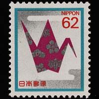 | 解説文 | 通称「慶弔用郵便切手」。1982.8.23発行の折鶴慶事用60円郵便切手の刷色を変更、料額を62円とした。昔から「鶴は千年、亀は万年」といわれ長寿、吉祥の鳥とされている。この折鶴には、やはりおめでたい松竹梅が描かれている。大谷文人(構成)。 |