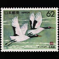 | 解説文 | 北海道。 タンチョウは、日本の代表的なツルで、ツルの中でも、もっとも美しいといわれ、中国東北部、南シベリア、北海道等に生息しています。北海道の東部に生息しているタンチョウは、昭和27年に特別天然記念に物指定され、また、昭和39年には、北海道の鳥に指定されて、雄大な北海道を代表する鳥として道民に親しまれています。原画作者の川井坦氏(札幌市在住)は、現在、北海道教育大学教授(日本画)、同大学附属札幌小学校長を務めているほか、日本芸術院院友、北海道美術協会会員でもあります。 |