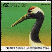 | 解説文 | ラムサール条約は正式名称を「特に水鳥の生息地として国際的に重要な湿地に関する条約」といい、1971年イラン国の「ラムサール」において採択され、1975年に発効しました。この条約は特に水鳥の生息地として国際的に重要な湿地及びそこに生息、成育する動植物の保全を推進することを目的としています。 タンチョウは我が国で見られる鶴の種類の中で、繁殖しているただ1種の鶴であり、我が国を代表する水辺の鳥といえます。明治後期には絶滅が伝えられましたが、大正後期に再発見され、保護の結果その数が増えて、昭和27年には国の特別天然記念物に指定されています。 |
