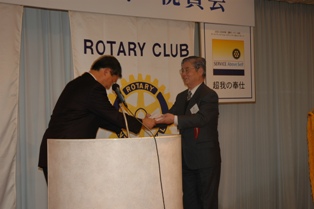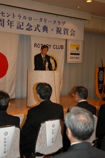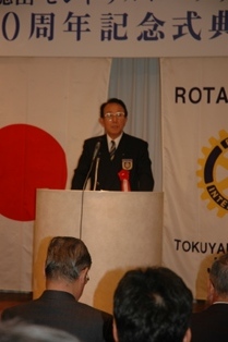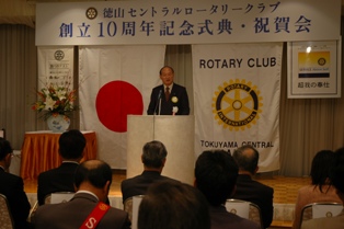 徳山セントラルロータリークラブ10周年、まことにおめでとうございます。心よりお慶びを申し上げます。 貴クラブは創立まだ10年というのに、その間、内外ともにその活発な活動ぶりには驚かされました。創立約1年で周南市の「フラワーフェスティバル」開催に参画、以来今年までバザーを出店、継続的に奉仕活動をしておられますし、また感心いたしますのは海外支援活動が大変多彩であることであります。関係した所は確かアルゼンチン、インドネシア、ネパール、ミャンマー、ガーナ、ウガンダと国際色豊かで本当に感心しています。 私達ロータリアンは、一般的な奉仕団体と違って、奉仕と同時に自己研讃を強く求めています,毎週1回の例会に出席して親睦の中、情報の収集、伝達、人格の形成と社会人として模範となるべく努めていますし、自己の職業をもっての奉仕、そして社会奉仕、国際奉仕へと輪を拡げているのであります。 貴クラブは創立10年で多くの奉仕活動を活発に実行され、ロータリークラブのお手本的存在であります。どうかこれからもこのエネルギーを失うことなく、精進を進めていただきたいと思います。貴クラブのますますの発展と、会員ご家族のご健勝を心から願って祝辞といたします。本日はまことにおめでとうございます。 |