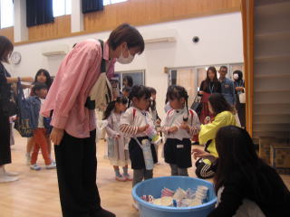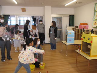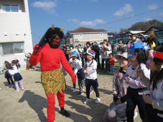 今年も赤鬼と青鬼が、幼稚園にやって来ました。鬼を退治するための豆を持ったまま、鬼を前に泣き出す子もいました。だんだんと慣れるにつれて、鬼に向かって威勢よく豆を投げ、心の中の鬼も一緒に退治できました。 |