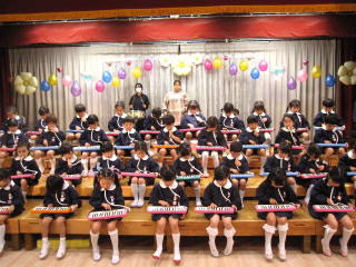今年もたくさんの卒園児が、同窓会に来てくれました。約4ヶ月ぶりに会った子ども達は、一回りも二回りも大きくなり、小学校の様子を話してくれました。みんなで、ビンゴ大会や玉入れなどして楽しい時間を過ごしました。 |
