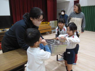 給食センターのご協力で、学校給食に備えて学習しました。配膳や食事のルールなどのお話を聞きました。次に、食器の片付け方や、食缶の持ち運び方などを実際に練習しました。小学校の入学が待ち遠しいですね。 |
