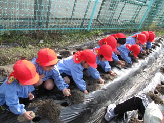 ジャガイモの種イモを植えました。子ども達は、畑に掘った穴に種イモを入れて、土の布団を優しく掛けました。子ども達は、種イモに興味深く見入っていました。収穫が楽しみです。 |