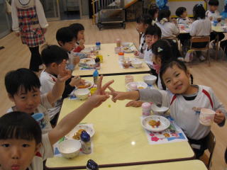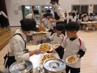 給食調理員さんのご協力で、年長さんに卒園の思い出としてバイキング給食をしました。2種類のおむすび、鶏の唐揚げ、魚のフライ、フライドポテト、すまし汁、パフェと盛り沢山でした。笑顔満面の子ども達でした。 |