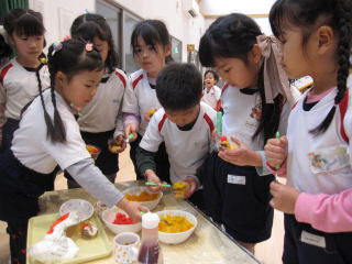 この日のカレー給食は、幼稚園の畑で子ども達が収穫したタマネギとジャガイモを使いました。子ども達は調理員さんや担任の先生達にサポートしてもらいながら、包丁で細かく切りました。いつも以上に美味しいカレーに大満足でした。 |