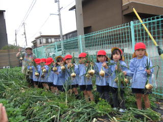 昨年の11月に植えた玉ネギの収穫をしました。子ども一人3〜4個を目安に、玉ネギの茎の付け根を持って引き抜きました。勢い余って尻餅をつく子が何人もいました。6月のカレー給食が楽しみです。 |