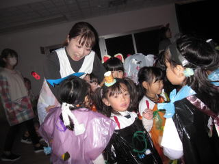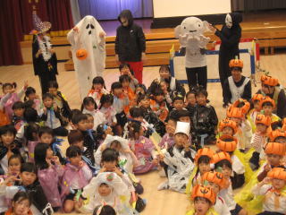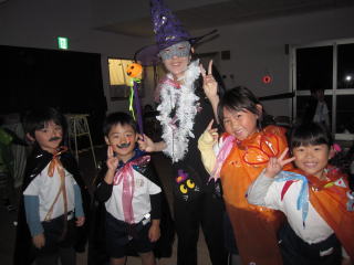 みんなで仮装してハロインパーティーをしました。パーティーに出てくるお化けを怖がって先生に抱き付く子、泣き出す子、大喜びの子など、色々な子どもの姿を発見しました。 |