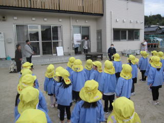 年長組は、下松消防署に見学に行きました。梯子車の梯子が伸びる様子や、救助訓練の様子を見学しました。また、貴重なスモーク体験や、色々な消防車と救急車など盛りだくさんの見学をさせていただき、子ども達は興味津々でした。 |