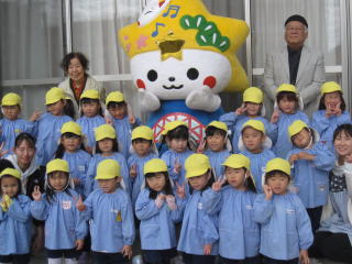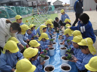 年中組が、この行事に参加しました。始めに、子ども達は市民憲章を大きな声で唱和しました。次に、ビオラやシクラメンの花の苗や、チューリップなどの球根を植えました。「くだまる」から、記念品をもらい集合写真も撮りました。 |