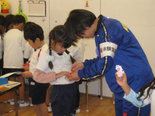非常ベルを鳴らしての訓練では、避難がとても上手にできました。また、消火器を使った訓練では、年長組の代表が上手に火元に水をかけていました。火災の多い冬です。みんなで暖房器具は正しくつかっていきましょう。 |