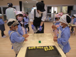 今年のたくさん取れたサツマイモを使って、調理員さんに協力してもらい、子ども達はスイートポテト作りに挑戦しました。つぶして、形を整えて、焼いてもらって、とても美味しいスイートポテトになりました。 |