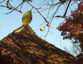 伊藤さんの萱葺き屋根の生家裏に柿の実が…。