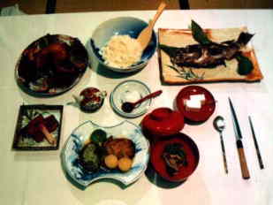 フナ・コイのせごし、刺身(新しくて珍しいもの)、野菜や肉をスープで煮込んだシチュー、