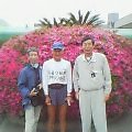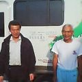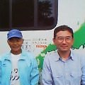 | 5月4日 | 野栄〜銚子市 | 26.0 | いかにも雨が落ちそうな空模様、町役場(光)まで車で12キロ走り、再度町長(斉藤 譲さん)へお会いしたい旨自宅へ電話すると、快く役場まで足を運んでいただき、図書館等案内(見学)していただき、お土産までいただいて大恐縮。・・・コース(野栄村)へ戻ってRun開始(10時00分)・・・1日中小雨がぱらつき、凄い風、九十九里ヶ浜最北の町飯岡町を通過するときはボウシはかぶれず、打ち上げる波しぶき(と言うより波)をざんぶりとかぶる。飯岡町からは山越えのためやややわらぐ。・・・銚子を過ぎ銚子大橋(利根川・海上約1キロ)にかかる、Runは何とかできるが運転する妻(高所恐怖症)は狭く、高く、長い橋、横風、がかわいそう・・・取って返して運転を代わり橋を渡る・・・渡ったところは鹿島郡波崎町(長い三角州の先端)、ますます風は強くなり、Run中止・・・理髪店HearsYouのマスター(大塚さん)の紹介で休業している店の駐車場を借りて泊。夜には雨も加わって大荒れ。 | 斉藤町長さんと![]() |