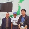 | 5月19日 | 北上〜本吉町 | 44.0 | 天気がめまぐるしく変わる、今日は晴れの予報だが明日は雨、今日は思い切って進みたいとの思いから6時半Run開始、少し行くとトンネルが4つ(車で抜ける)・・・山中にある温度計が14℃をさしている、Runには最適快調、さすがリアス式海岸、一服し、30分走って、ふと対岸の目の前(500m)にキャンピングカー・・・湾を迂回して何か元に戻ったような気分・・・妻に電話で連絡し手を振って走る・・・10時、志津川町の中心で私の指示ミスで車が先行してしまった。・・・車に追いつき一服していると壮年の方(朝緑康之助さん・・文房具店経営)より声がかかり・・・車のナンバーを見られて「山口県がなければ今の日本はない(明治維新のこと)」とおっしゃり・・・「お茶をご馳走になる」・・・そして是非、新聞社(城洋新聞(記者 佐藤 洋さん)に取材をとの申し出に取材を受ける・・・今日は泊先を「道の駅大谷海岸」に決めてのRun全て走るには少し長い・・・3時半、あと6キロを残して道の駅(ここでも日本1の看板・・・海岸に一番近い駅)へ車で・・泊 | 朝緑さん・佐藤さんと![]() |