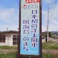 写真は左より「風と海と緑の町の看板」「風車」「応援に来てくださった西村さんご夫妻」「珍しい地名猿払村」