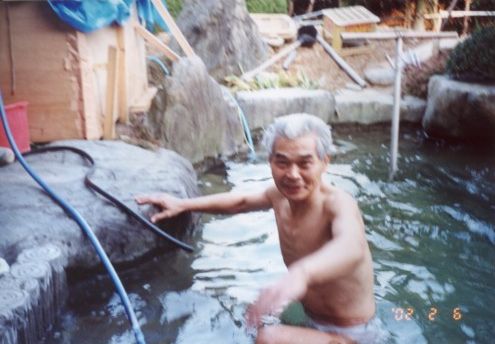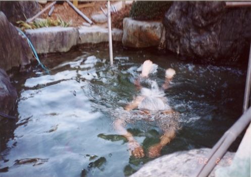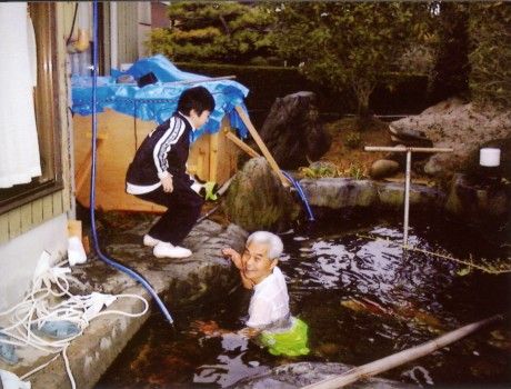 平成13年暮から平成14年にかけてこの家の主人(克己氏)が池を改造した、改造完成記念に私(紀香)と一緒に2月6日午後5時30分、朝起会婦人部の皆さんが見守る中、寒中水泳(水温6℃)した思い出の池です。