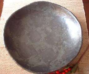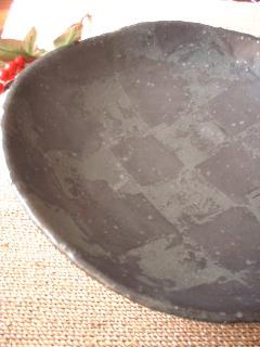 市松模様の丸皿です。全体の形、特に縁に向かって緩やかに変形していて味わいがあります。 見た目より高さがあるので、少量なら汁気のものも、だいじょうぶ! 各種スパゲティを盛ってみたいです。